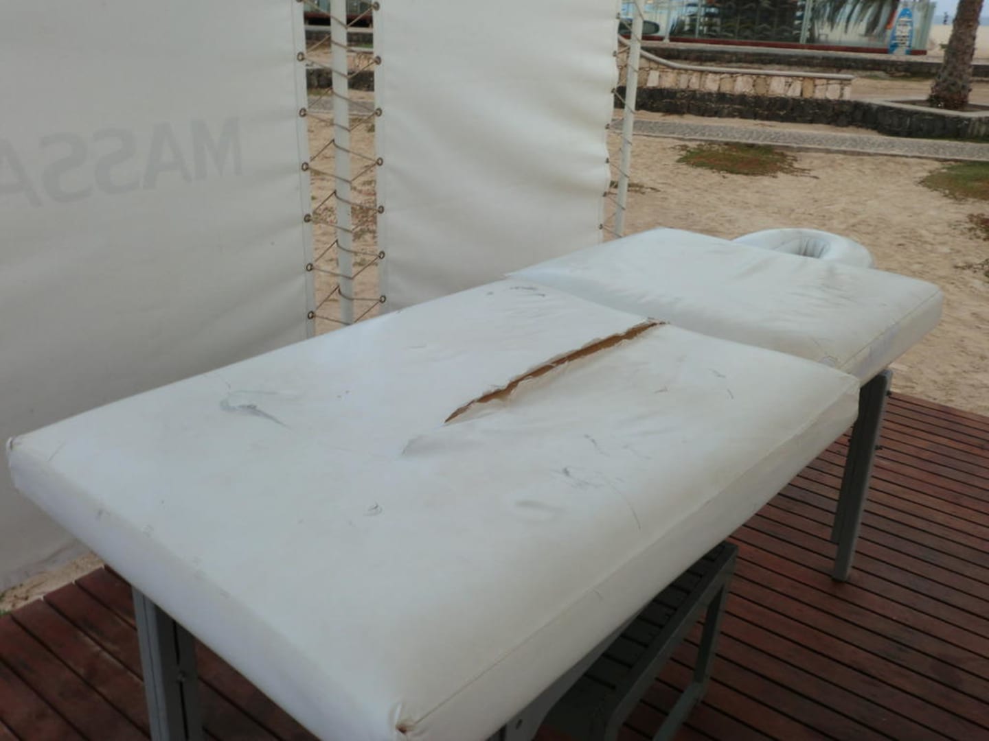 Sehr einladend!!!! Zerrissene Massageliege, die hinter einer Sichtbespannung in der Gartenanlage steht. Wellness und Spa gibt es im Hotel nicht.