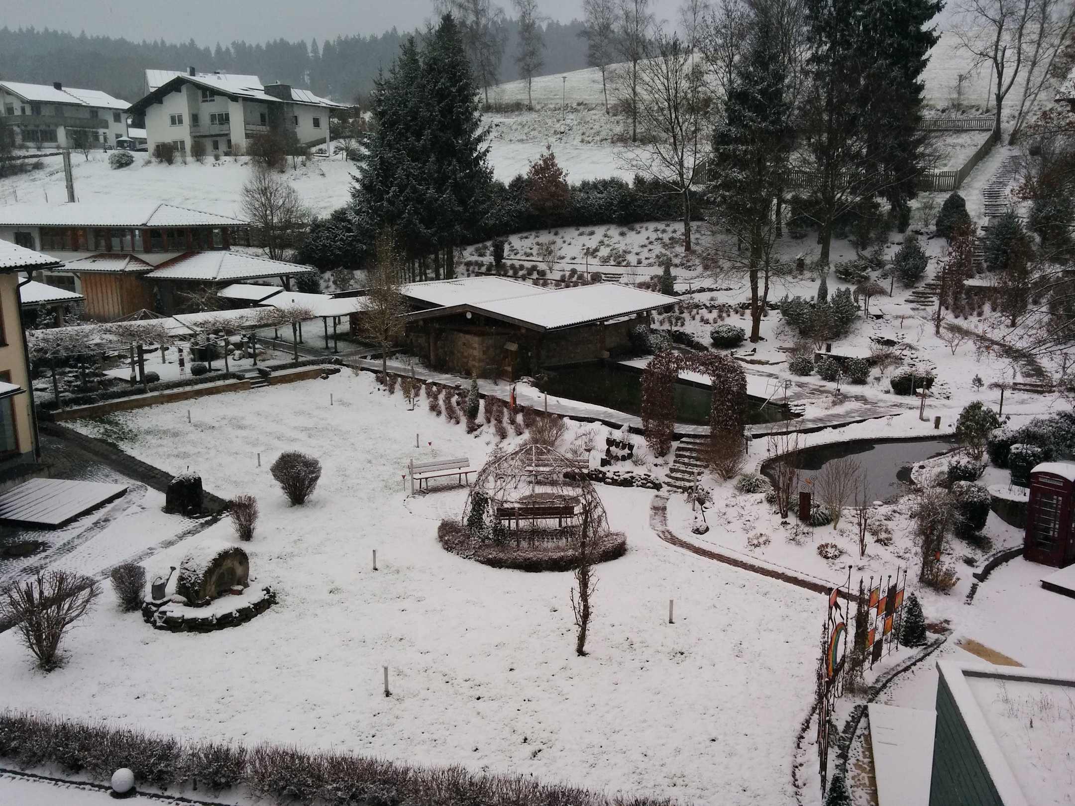 Gartenbereich mit Blocksauna und Naturteich.