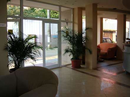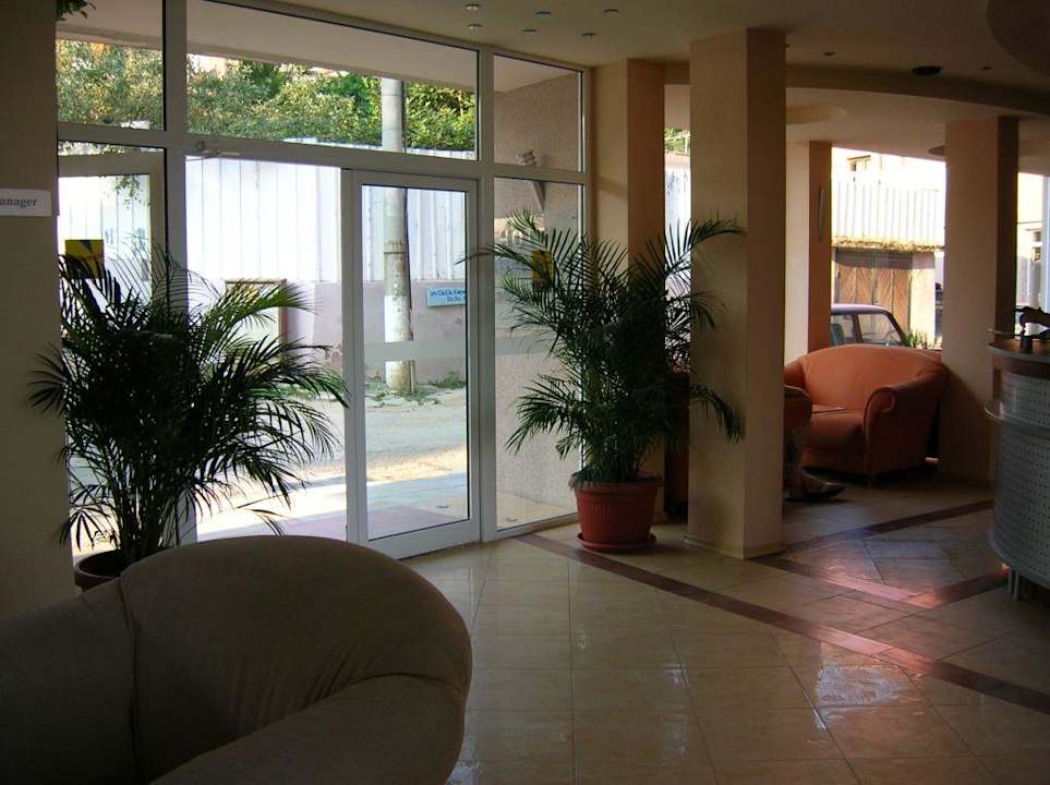 Lobby mit Sicht auf Eingang des Hotels