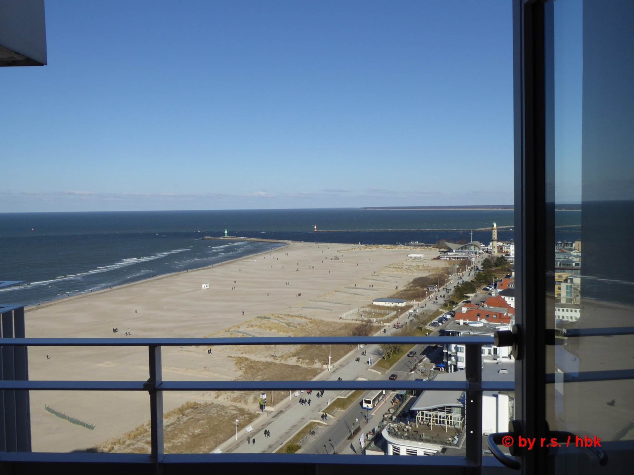 Blick aus dem Zimmer über Balkon zum Strand und Leuchtturm