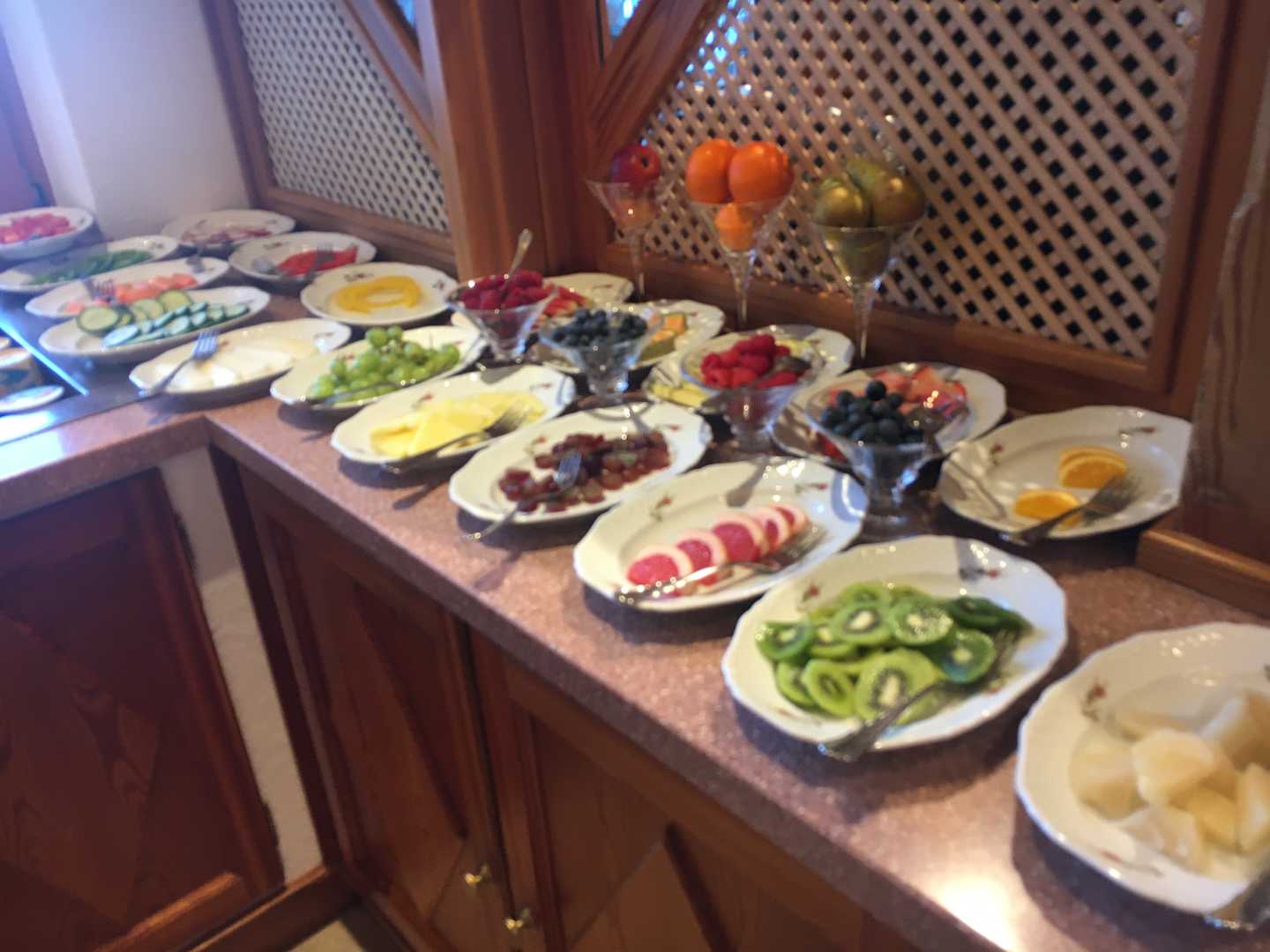 Frühstücksbüffet mit reichlich Obst und Gemüse.