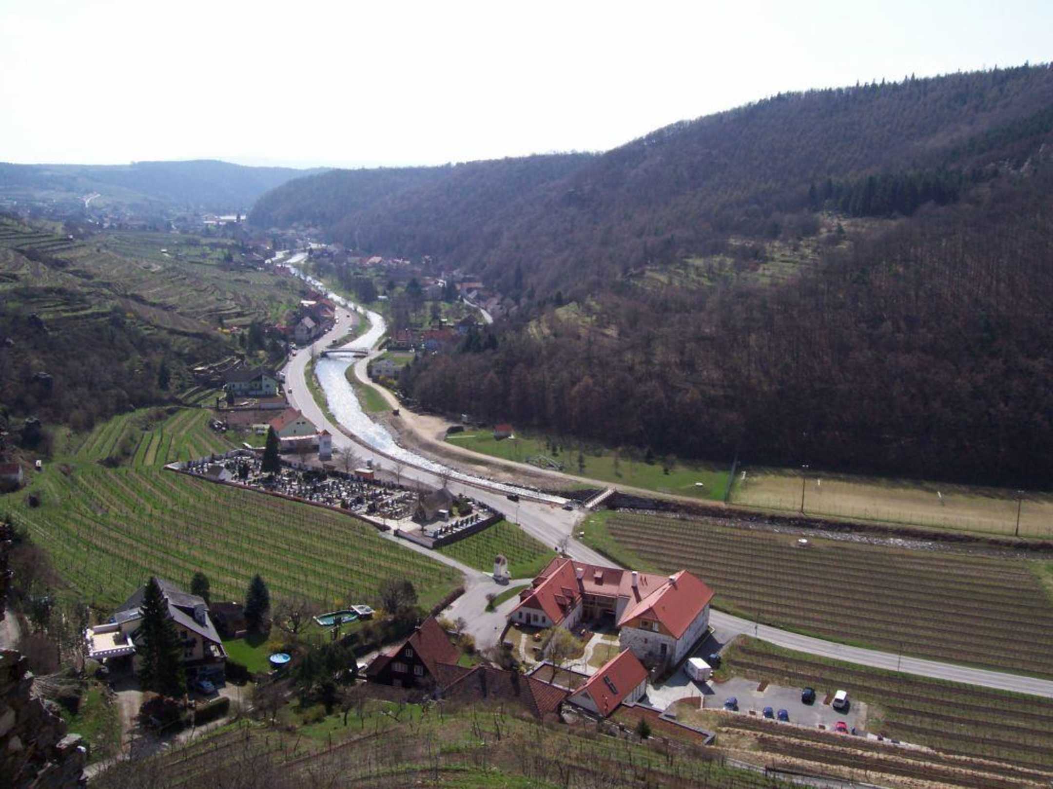 Das Weingut Nigl und das Senftenberger Tal von der Ruine aus gesehen.