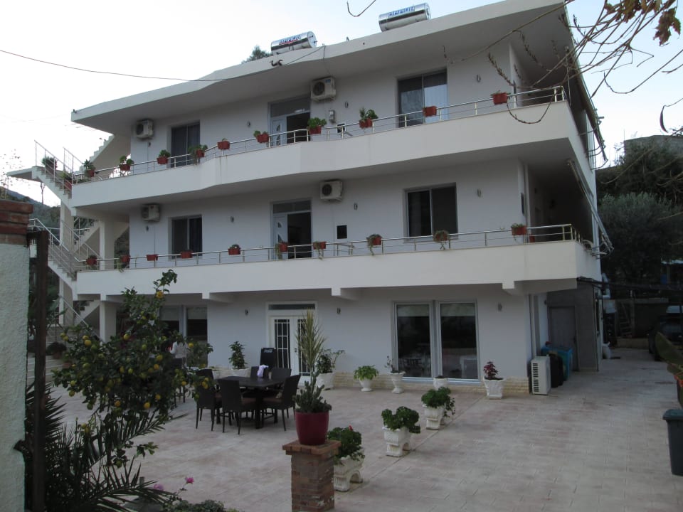 Blick über das gepflasterte Vorgelände auf das Hotel Nika. Gut zu erkennen die umlaufenden Galerien mit den Balkonabschnitten für jedes Zimmer, hinter dem Haus ein kleiner Wildbach.