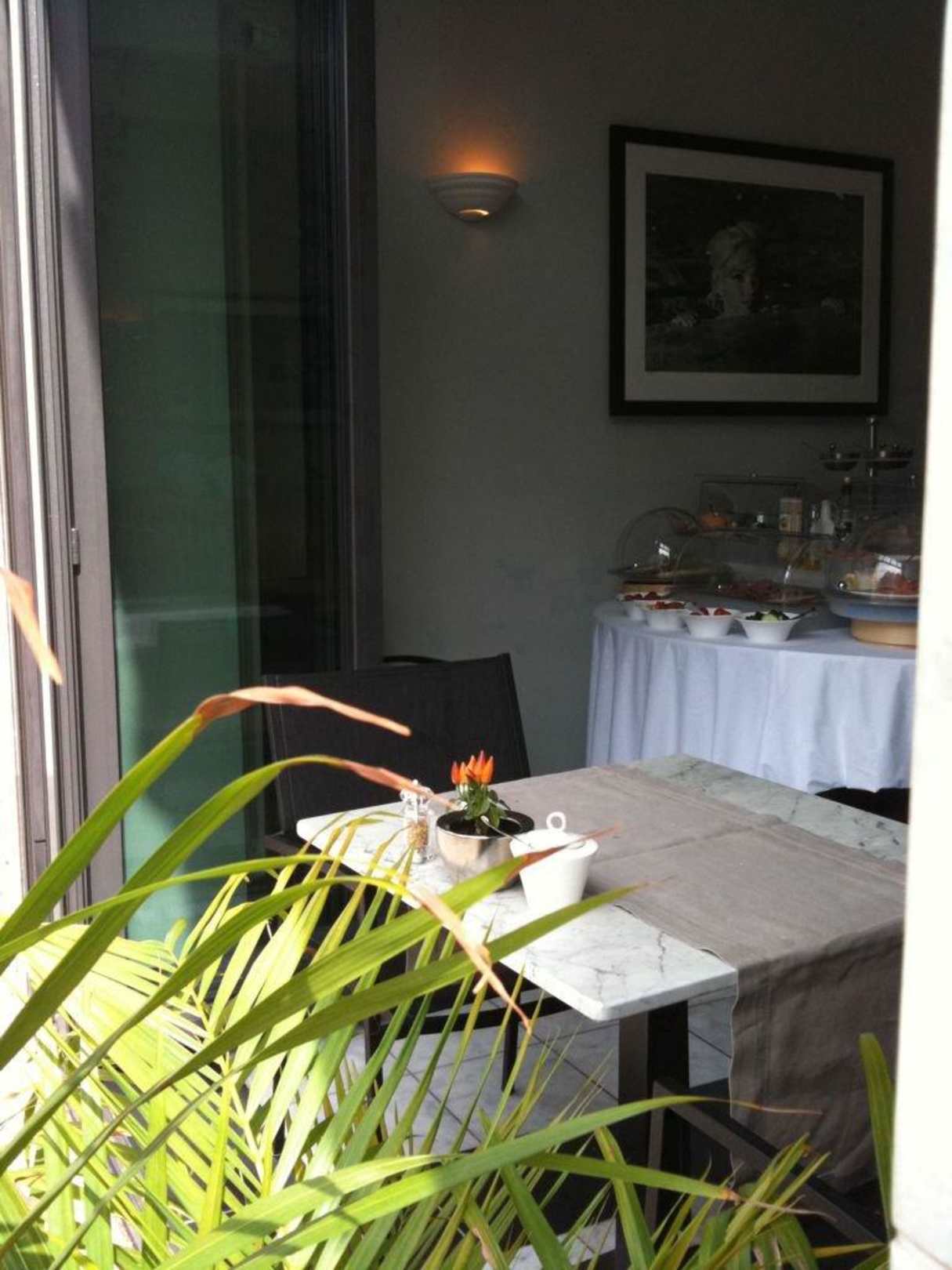 Hotel NikolaiCute small tables in the breakfast room. Partly, they are completely open to the street.