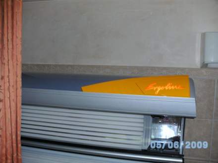 ein modernes solarium in eine ecke gequetscht, von neugierigen blicken nur durch den orangenen vorhang getrennt vom "ruheräumchen" der sauna. da kriegt man leicht platzangst!