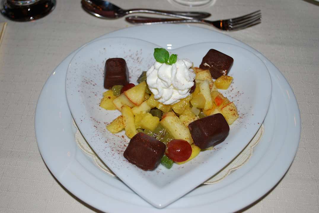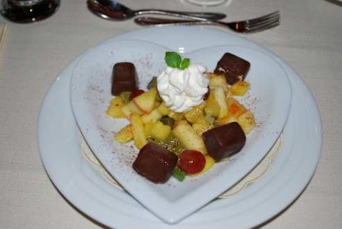 Eispralinen und Fruchtsalat.