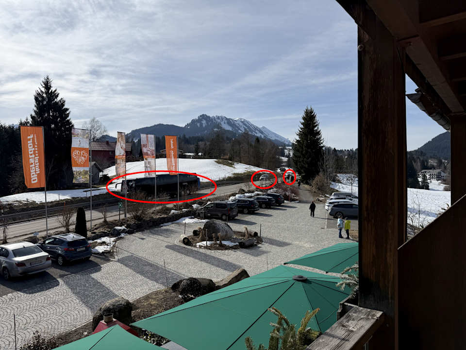 Seitliche Bergblick vom Balkon. Bundesstraße mit Bus- und PKW-Verkehr.