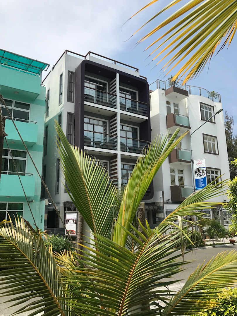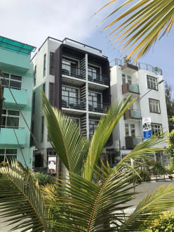 Es ist das Haus mit den schwarz eingerahmten Balkons.