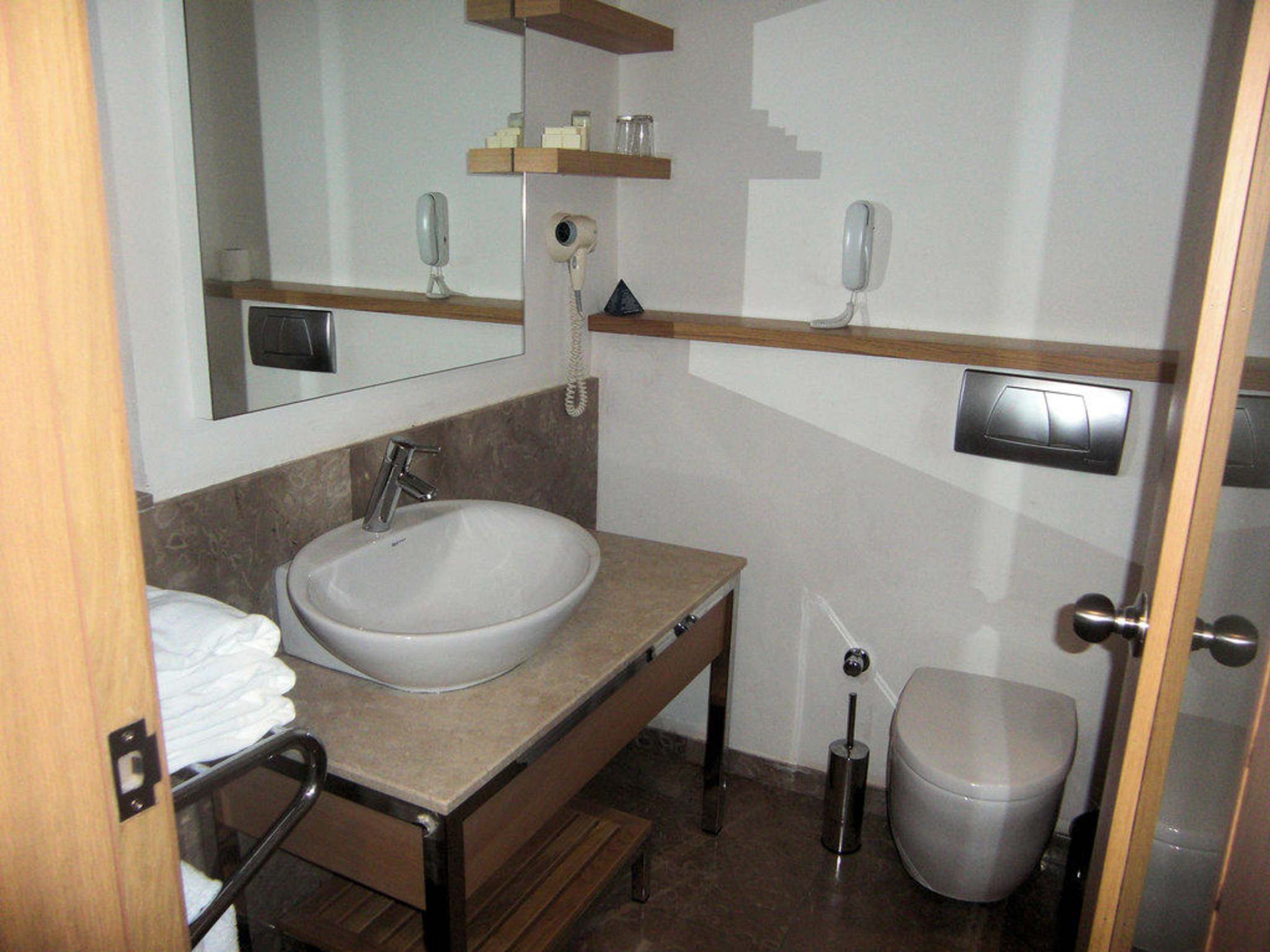 Das Bad, die Dusche ist rechts, hinter der Tür