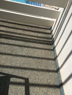 ZimmerKörniger Belag auf dem Balkon, löst sich und bleibt an den Füßen bzw. Schuhen ungangenehm hängen, bevor man ins Zimmer geht Füße reinigen!