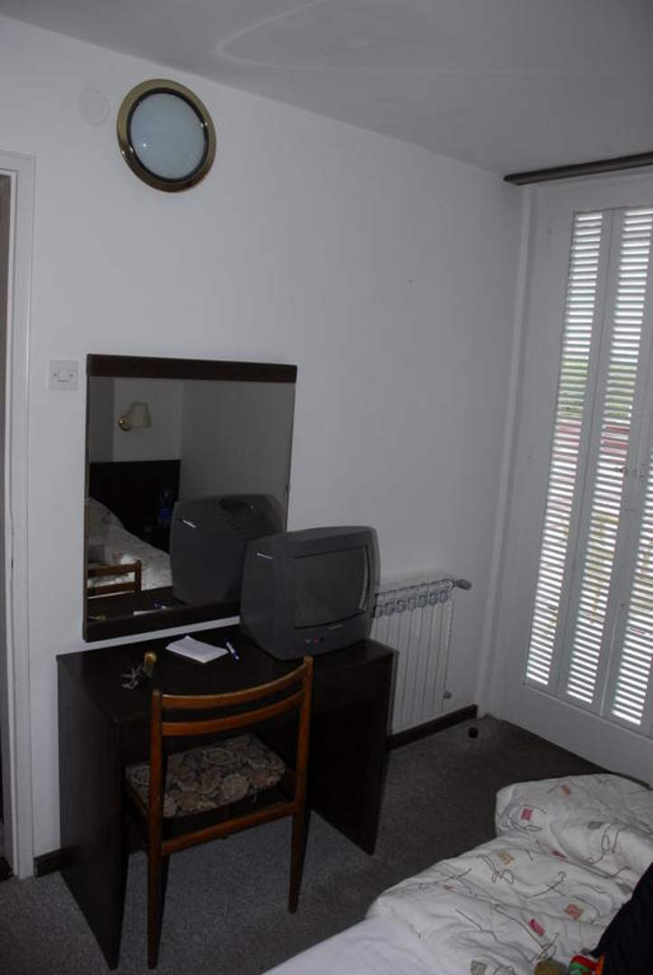Blick auf den Schreibtisch und die Balkontür