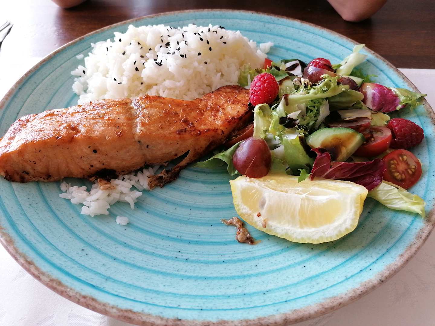 Lachs, Reis, Salat