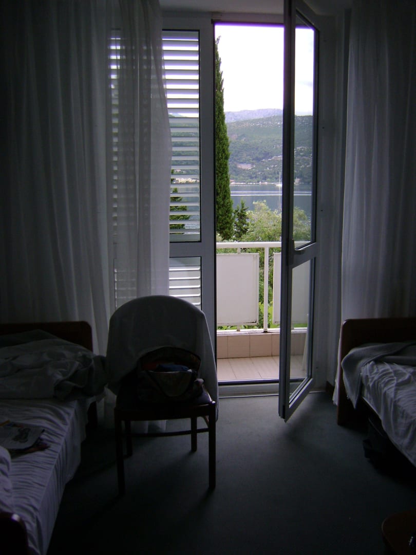 Doppelzimmer im Nebengebäude, der winzige Schreibtisch und ein weiterer Stuhl sind auf dem Foto nicht zu sehen. links vom Standort des Fotografen ein schmaler aber hoher Einbaukleiderschrank, rechts die Tür zum Mini-Bad.