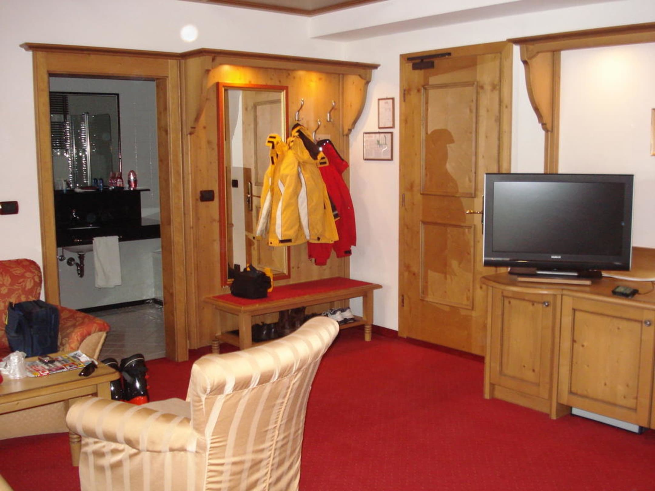 Blick auf den Zimmereingang und das Bad