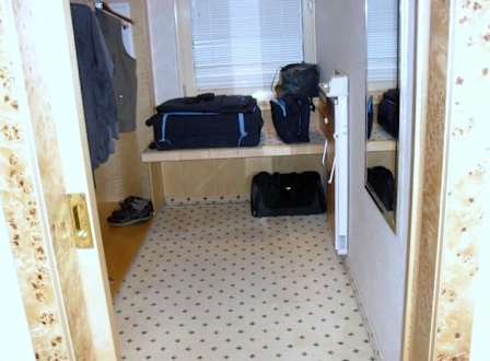 Ein separater kleiner Raum mit offenen Schrank, Minibar, Safe, genügend Platz für Kleidungstücke sowohl zum aufhängen als auch zum ablegen in den Regalen.