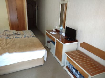 Zimmer mit Flachbild - TV, Kühlschrank ( Minibar ), Bett und Schrank.