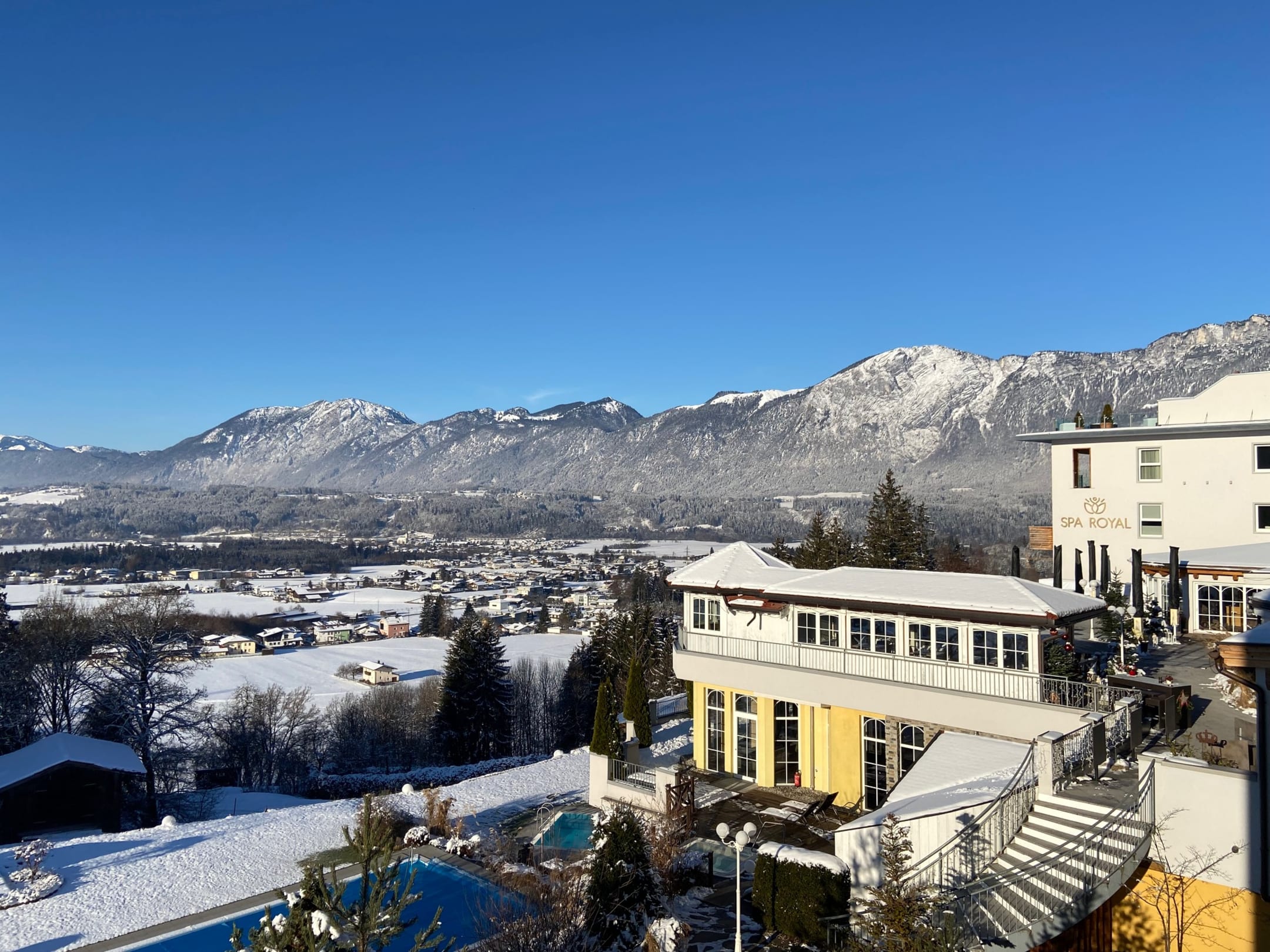 Ausblick auf Garten und Bergwelt im Winter