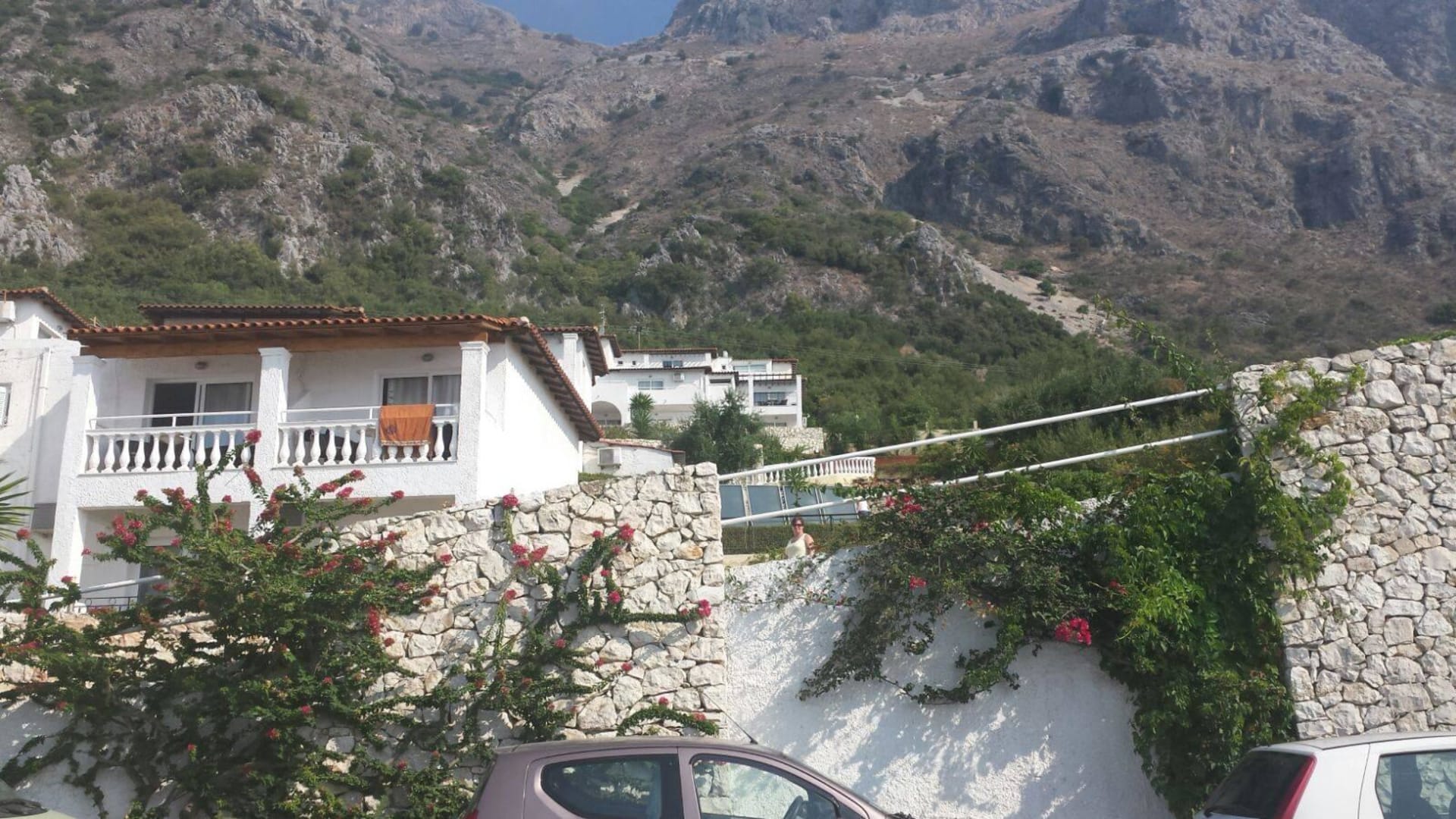 Blick auf unser Zimmer. Ganz oben Hotel Pantokrator
