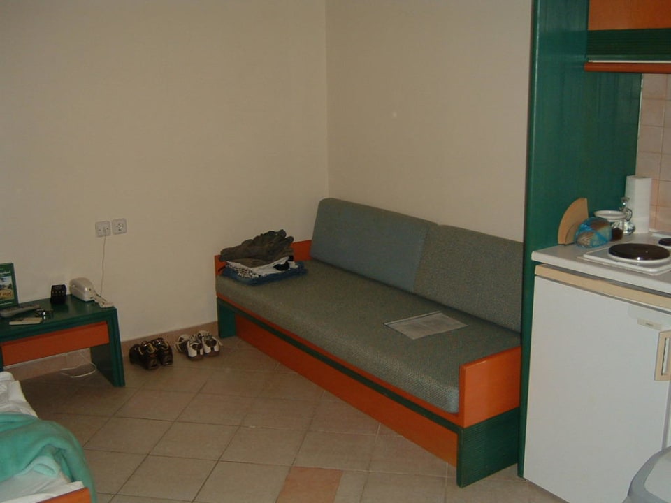 Schlafcouch, rechts daneben Küchenzeile