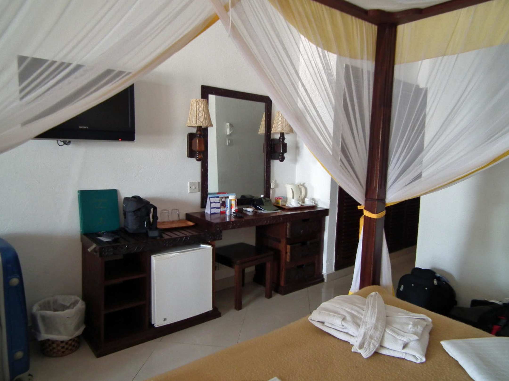Schreibtisch, Minibar und TV im zweiten Zimmer