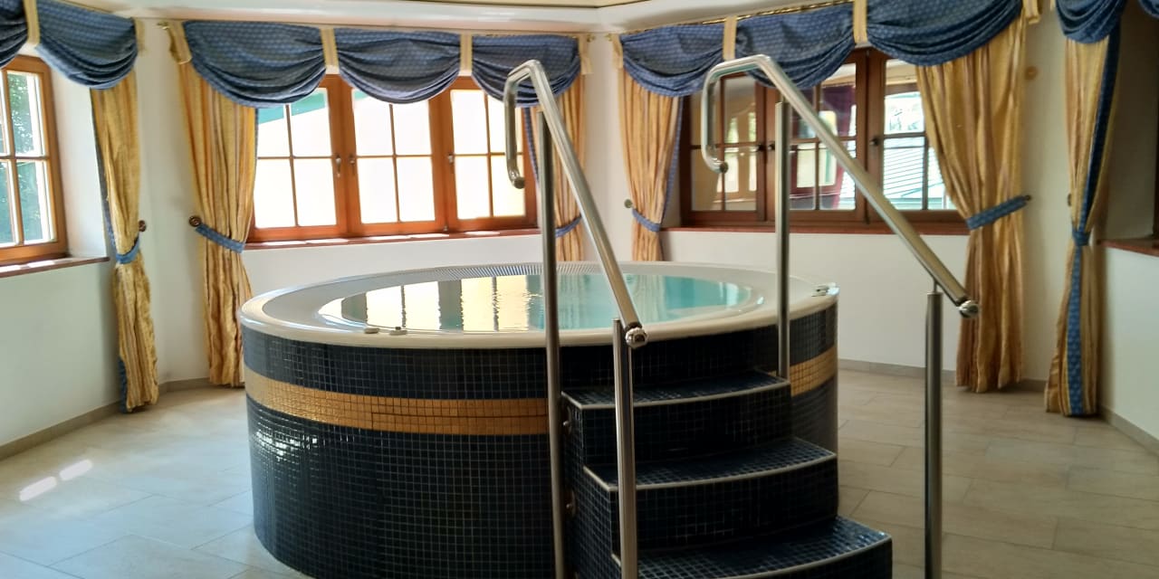 Einer von mehreren verschiedenen Whirlpools. Großzügig, hochwertig und mit Blick in den schönen Hotelgarten.