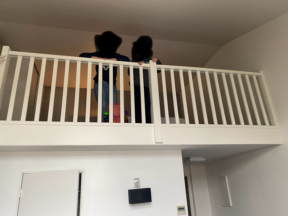 Hinter den Kindern steht ein Doppelbett und ein Kasten