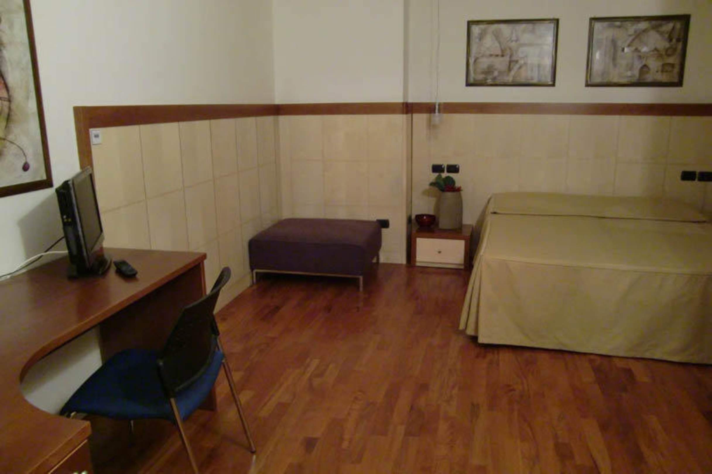Blick auf Schreibtisch und Bett