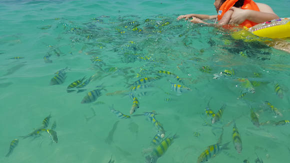 wenn man etwas Brot ins Wasser wirft, kommen hunderte Fische angeschwommen