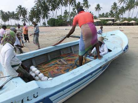 Beladung des Bootes das das lange Netz aufs Meer hinausbringt, das die Fischer herein ziehen.