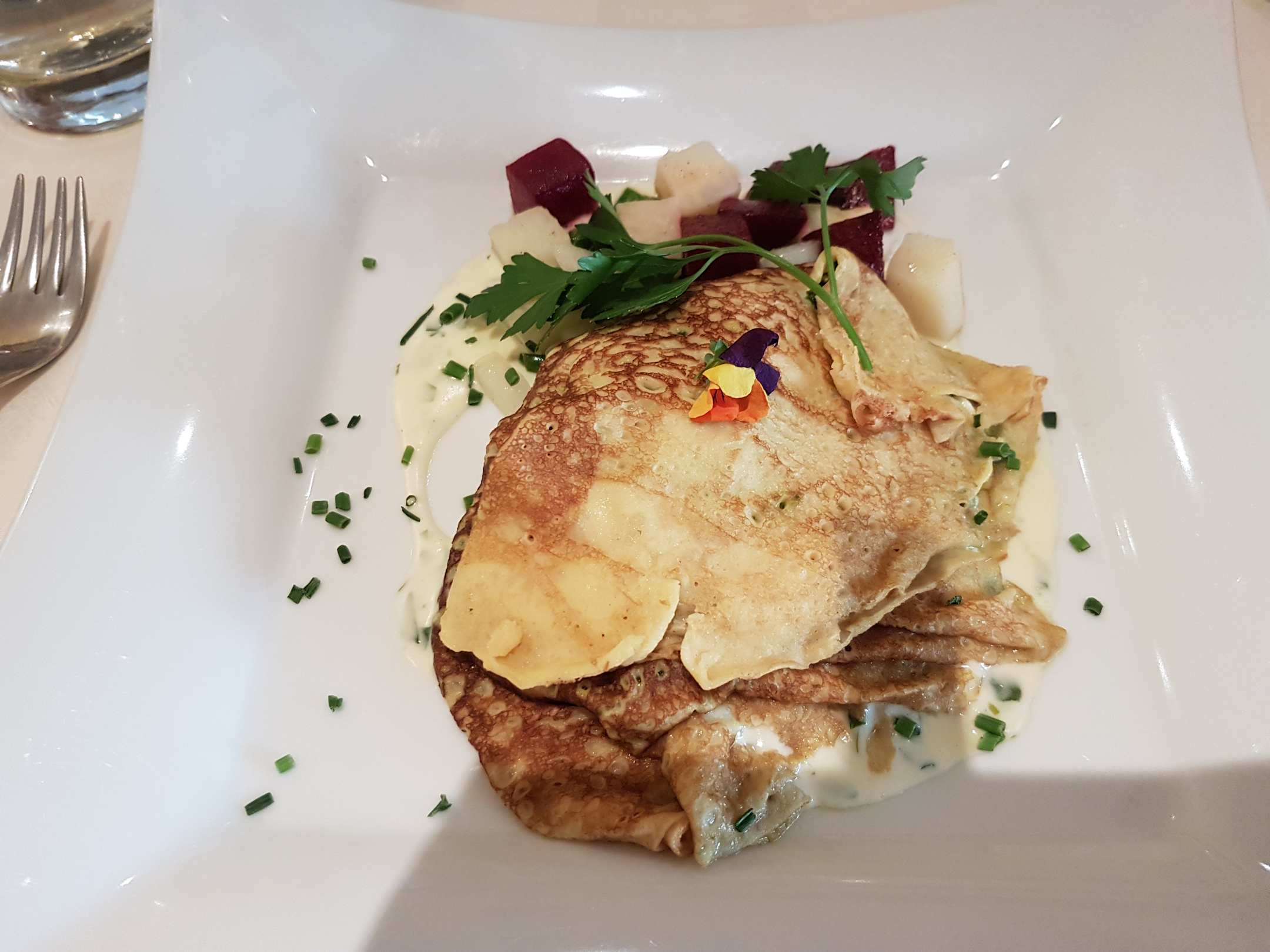 Dinkelpalatschinken mit Spinat und Schafskäse gefüllt