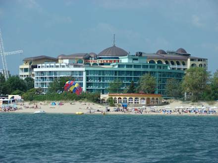 Dies ist die Hotelansicht vom Schiff nach Nessbar aus (natürlich mit Zoom). Vor dem Planeta liegt das Hotel Colosseum.