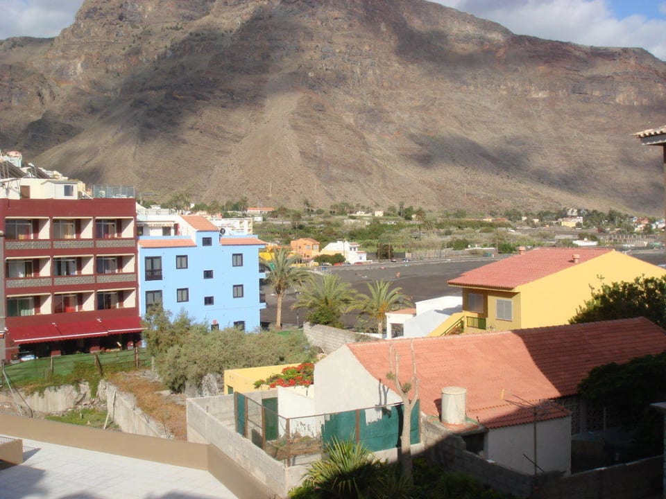 Blick vom Balkon auf die umliegenden Häuser und den Strand