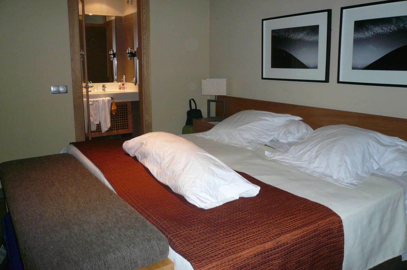 Die Betten waren schön groß und breit mit guten Matrazen und vielen Kissen. Am Fußende ein Holzpodest mit Polster, auf dem man die Koffer beim Ein- und Auspacken gut hinlegen kann und während des Urlaubs darunter.