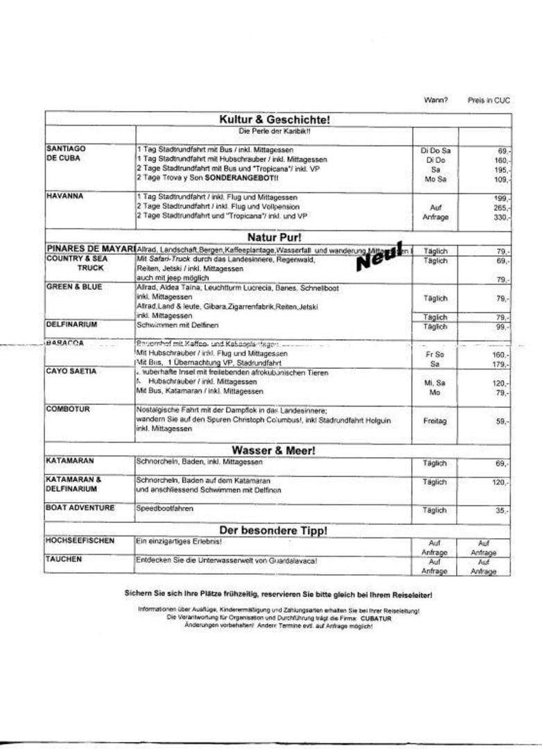 Übersicht kostenpflichtige Ausflüge