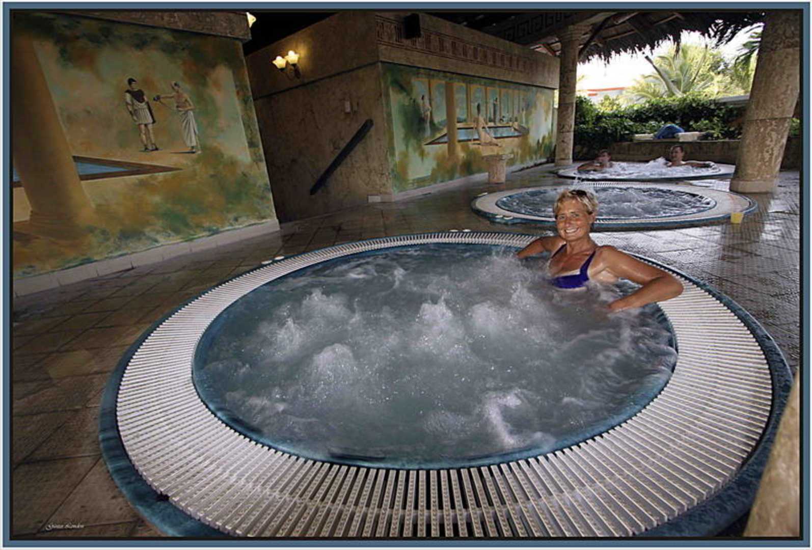 AbendvergnügenIn der Sporthalle des Hotels Playa Pesquero bieten vier schön angewärmte Becken auch bei Schlechtwetter Badevergnügen.