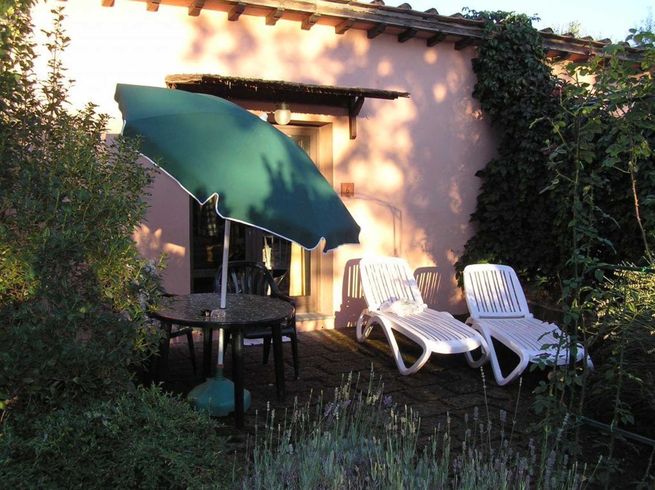 Zu jedem Zimmer gehören 1 Tisch mit Sonnenschirm und 2 Sonnenliegen.