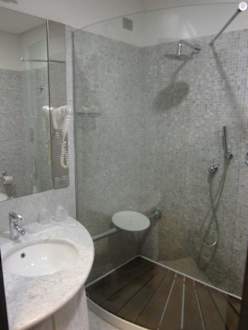 Waschbecken und Dusche mit Holzrost zum Draufstehen und Regen-Duschkopf. Jedoch kam entweder warmes oder kaltes Wasser. Etwas zwischendrin gab es leider nicht.
