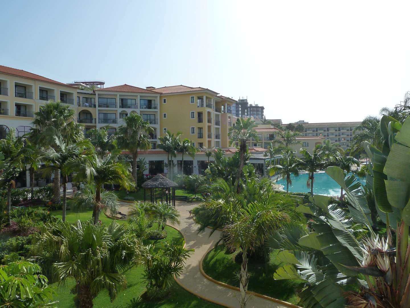 Blick vom Zimmer Richtung Restaurant, Garten, Pool