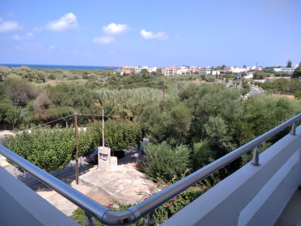 großer Eckbalkon mit Panoramablick über Hoteleingang, Bäumen, Wege, bis zum Meer