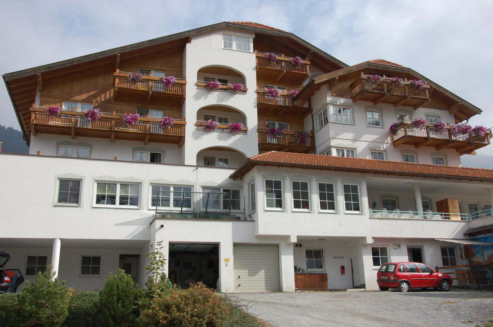 Rückseite des Hotels mit den Parkplätzen und Garagen.