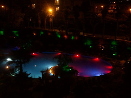 Vom Zimmer, Blick auf den Pool bei Nacht