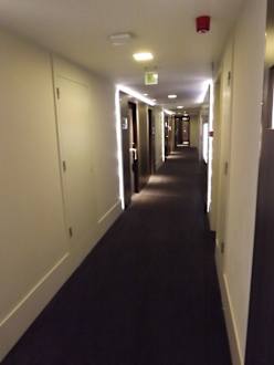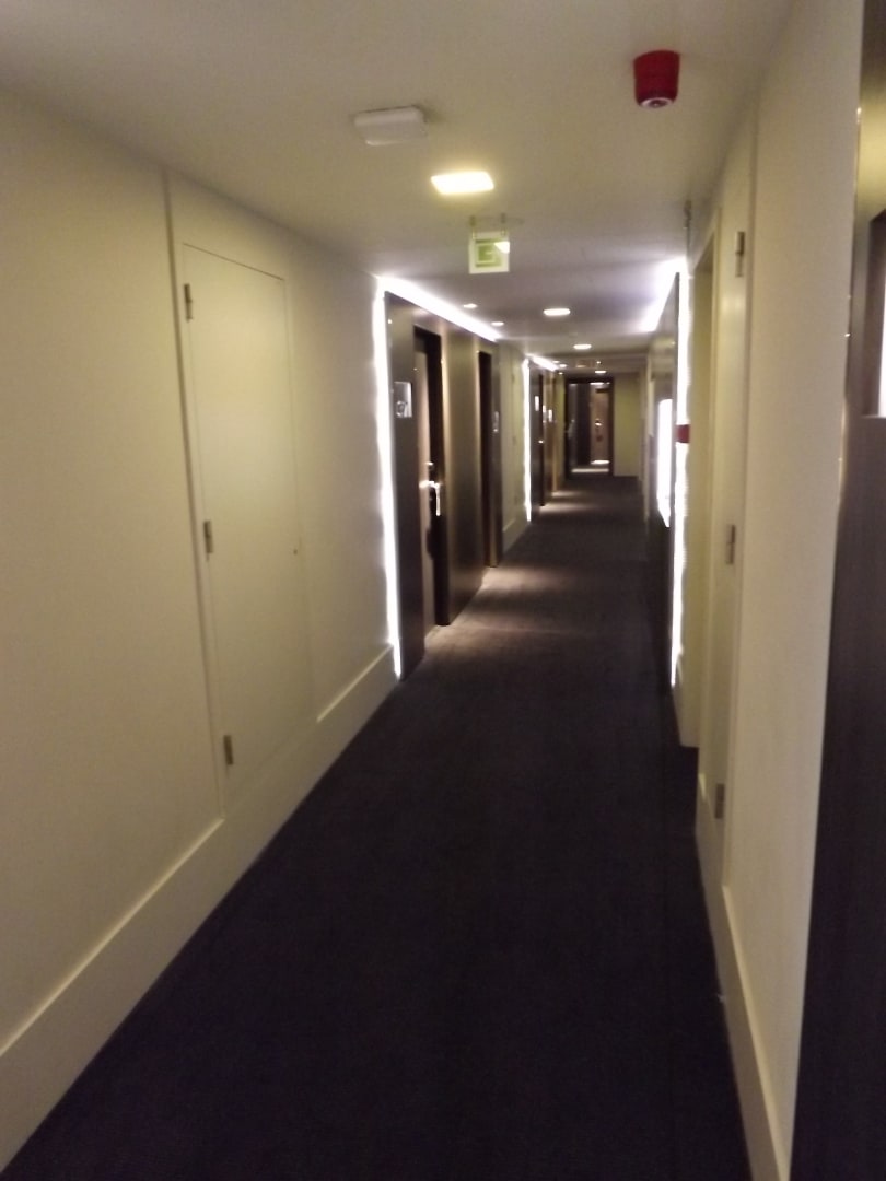 Hotelflur -dunkles Holz und helle Töne, eigentlich recht gediegen anzusehen.