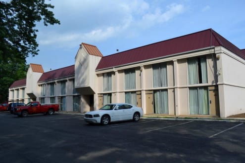 Die Parkplätze auf der Rückseite, das zweite Zimmer von rechts hinter dem Dodge ist mein Zimmer 151