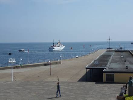 Balkon im 2. Stock mit Blick auf Promenade und Pier der sog. Bördeboote. Die Passagiere der Bäderschiffe müssen mittels der Bördeboote ausgebootet, bzw. übergesetzt werden.