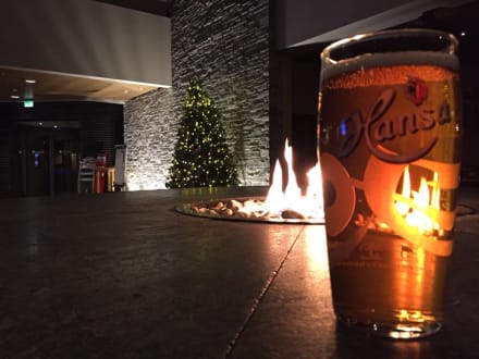 Feuerstelle an der Bar mit gemütlichen Fellhockern.