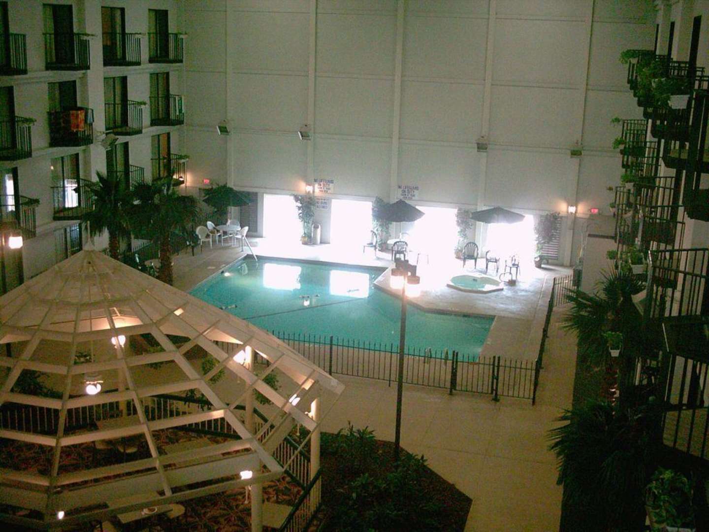 Hotelinnenraum mit pool links und rechts Zimmer