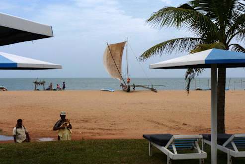 Strand mit Händlern und Katamaran