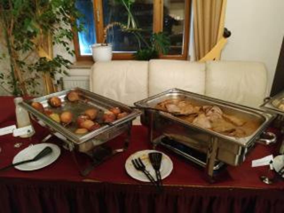 GastroDas sind Bratäpfel und Schweinebraten. Entschuldigen Sie,das ich diese fast leeren Behälter fotografiert habe.Kam vorher nicht ran,weil sich über 50 Leute auf dieses reichhaltige Büfett gestürzt hatten,was ja eigentlich als 3 Gang Menü gebucht war.