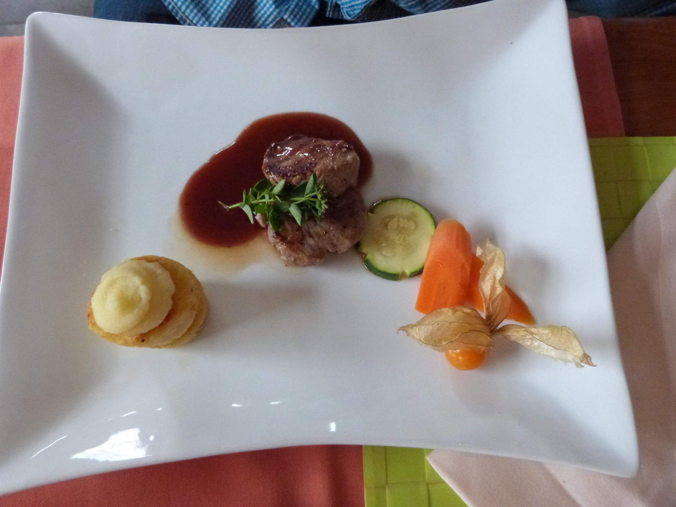Lecker!Gebratene Schweinemedaillions an Balsamico-Rowein-Jus mit sommerlichem Gemüse und Kartoffeltürmchen