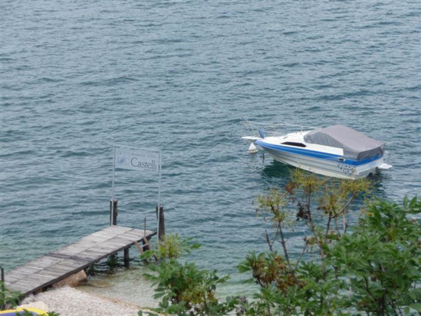 Der hoteleigene Strand mit Bootssteg vom Balkon aus